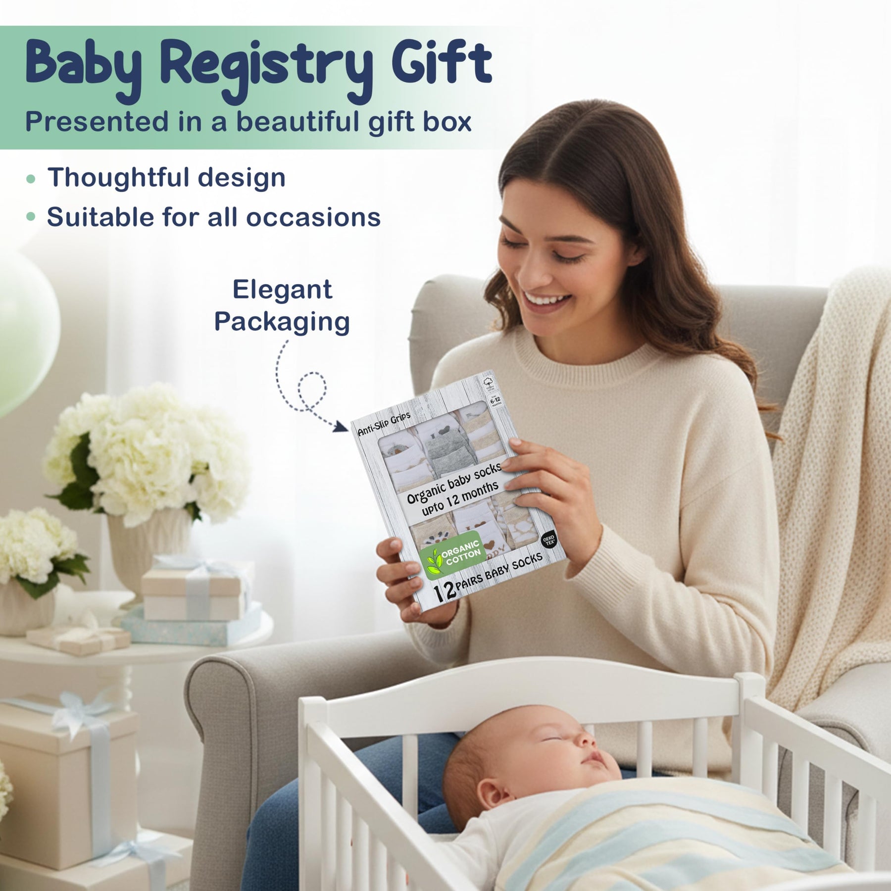 - 𝗦𝘁𝗮𝘆-𝗢𝗻 𝗧𝗲𝗰𝗵𝗻𝗼𝗹𝗼𝗴𝘆 𝗳𝗼𝗿 𝗔𝗰𝘁𝗶𝘃𝗲 𝗕𝗮𝗯𝗶𝗲𝘀: Designed with your baby's activity in mind, our socks feature a unique stay-on technology. They provide a snug fit and anti slip that stays in place throughout the day, perfect for babies aged 6 - 12 months who are always on the move. 75% Organic Cotton, 23% Polyester, 2% Spandex.