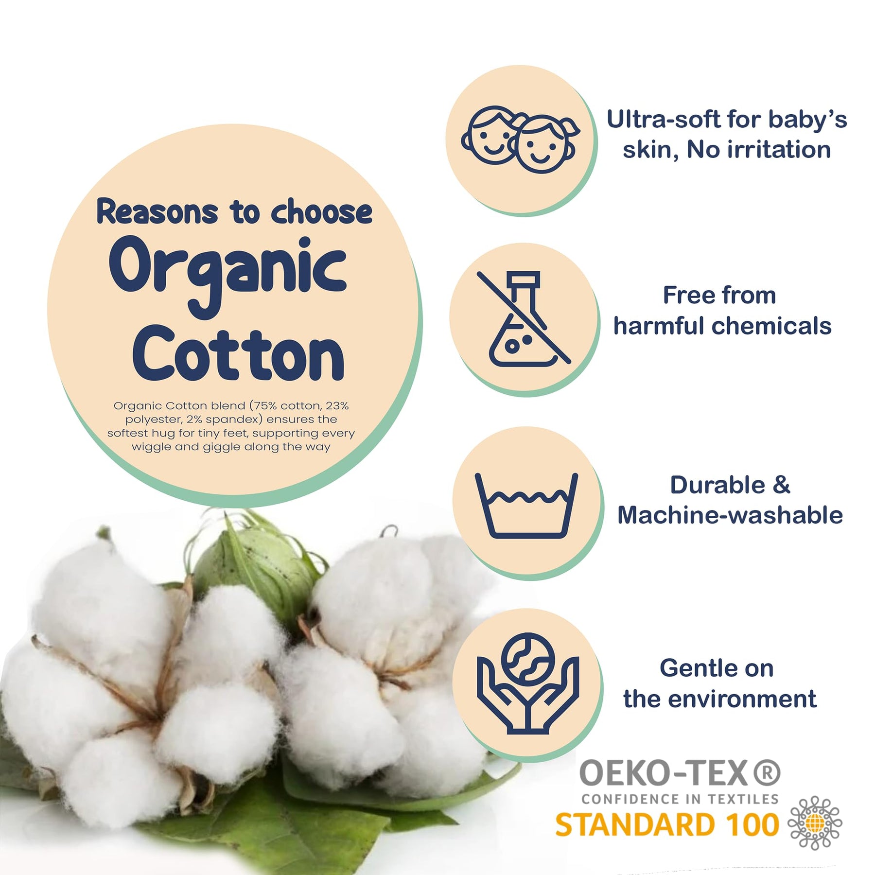 • 𝗦𝘁𝗮𝘆-𝗢𝗻 𝗧𝗲𝗰𝗵𝗻𝗼𝗹𝗼𝗴𝘆 𝗳𝗼𝗿 𝗔𝗰𝘁𝗶𝘃𝗲 𝗕𝗮𝗯𝗶𝗲𝘀: Designed with your baby's activity in mind, our socks feature a unique stay-on technology. They provide a snug fit and anti slip that stays in place throughout the day, perfect for babies aged 6 -12 months who are always on the move. 75% Organic Cotton, 23% Polyester, 2% Spandex.