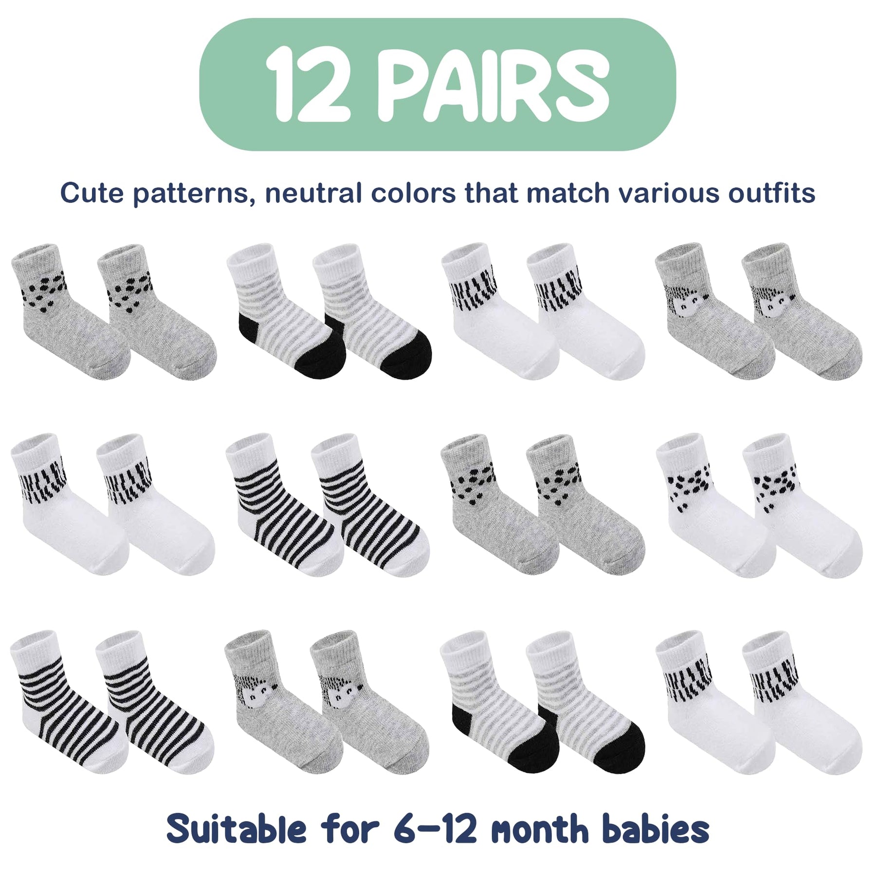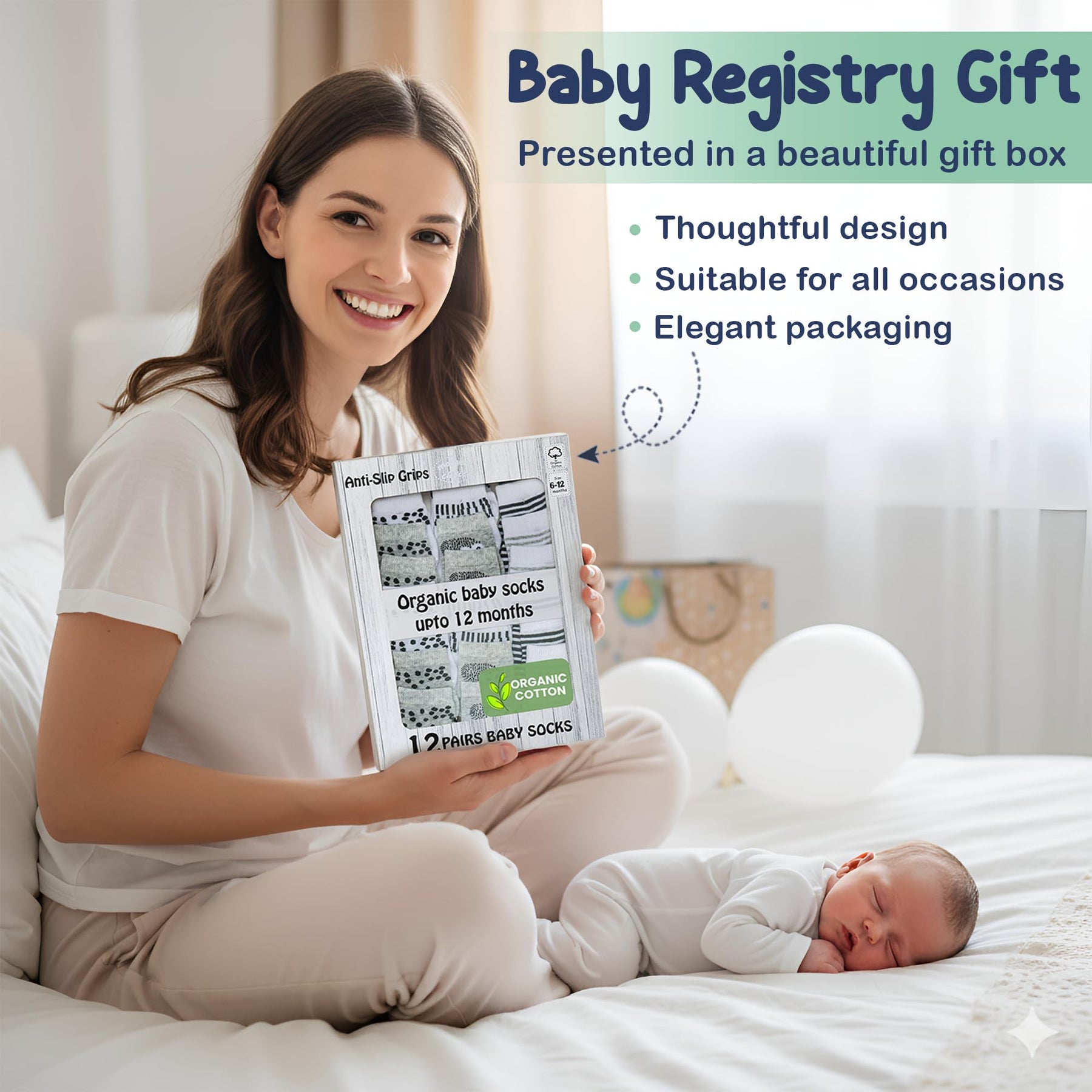Mother's Choice Organic Cotton Baby Socks 6-12 Months, 12 Pairs Unisex Anti Slip - Soft & Hypoallergenic Baby Girl & Boys Socks (US, Age, 6 Months, 12 Months, Gray - White)